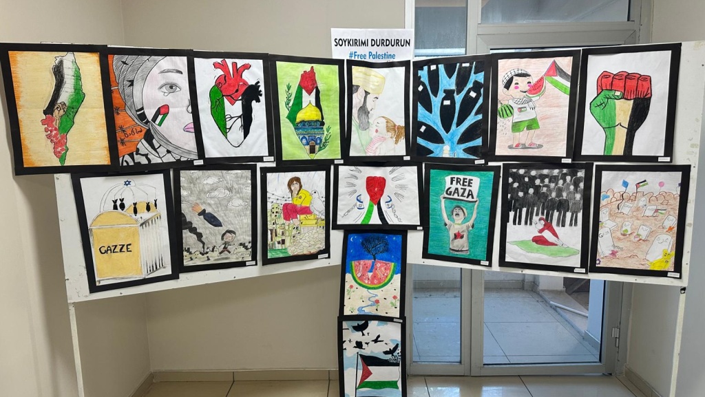 Okulumuz bünyesinde Filistin için öğrencilerimizin özveriyle çizmiş oldukları resimler sergilendi.